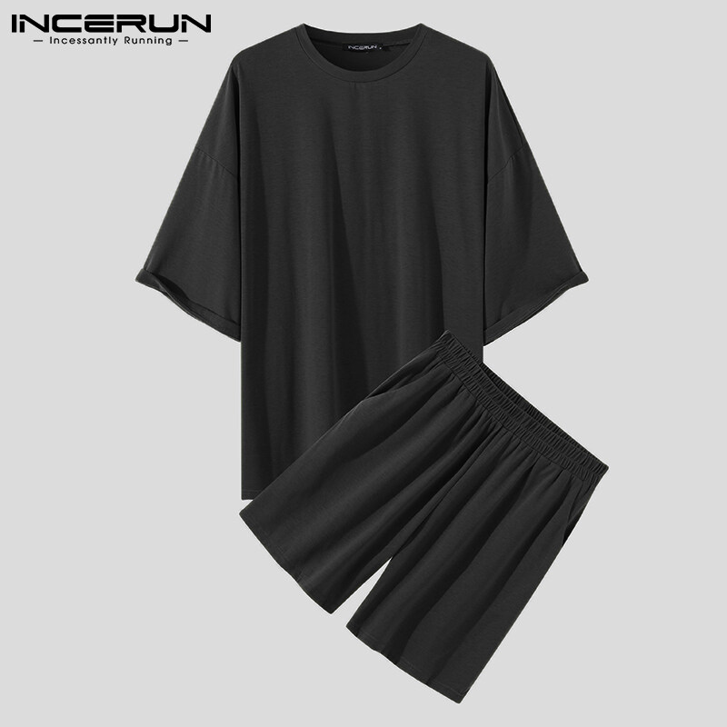 RisingHope Korea INCERUN 2PCS Mens Short Sleeve T Shirts Short Sleerwear Sets Sports Tracksuit Lounge Suit